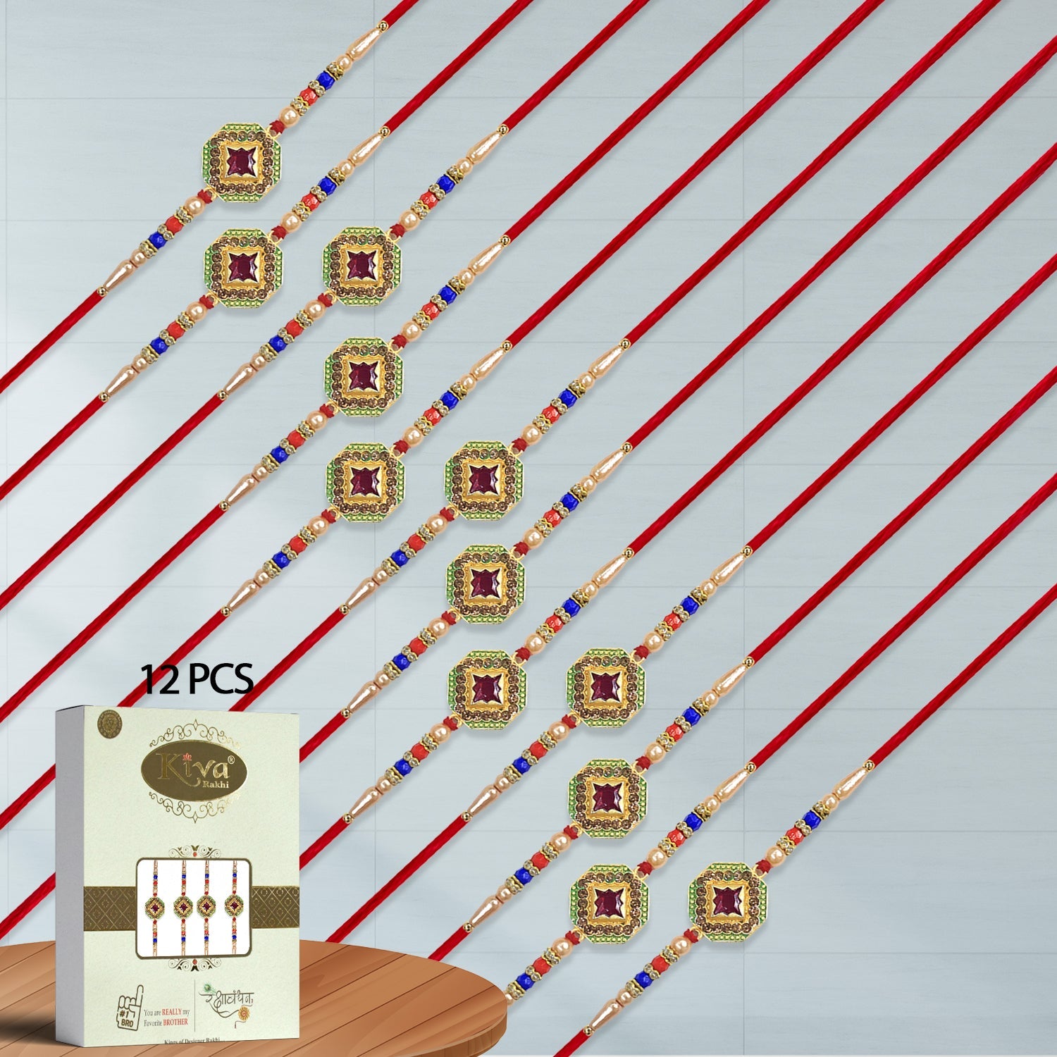 Celebrate the spirit of Raksha Bandhan in grand style with this value pack of 12 beautifully crafted Rakhis. Each Rakhi in the set features a vibrant multicolor centerpiece with traditional detailing, complemented by decorative beads and a soft, skin-friendly thread.