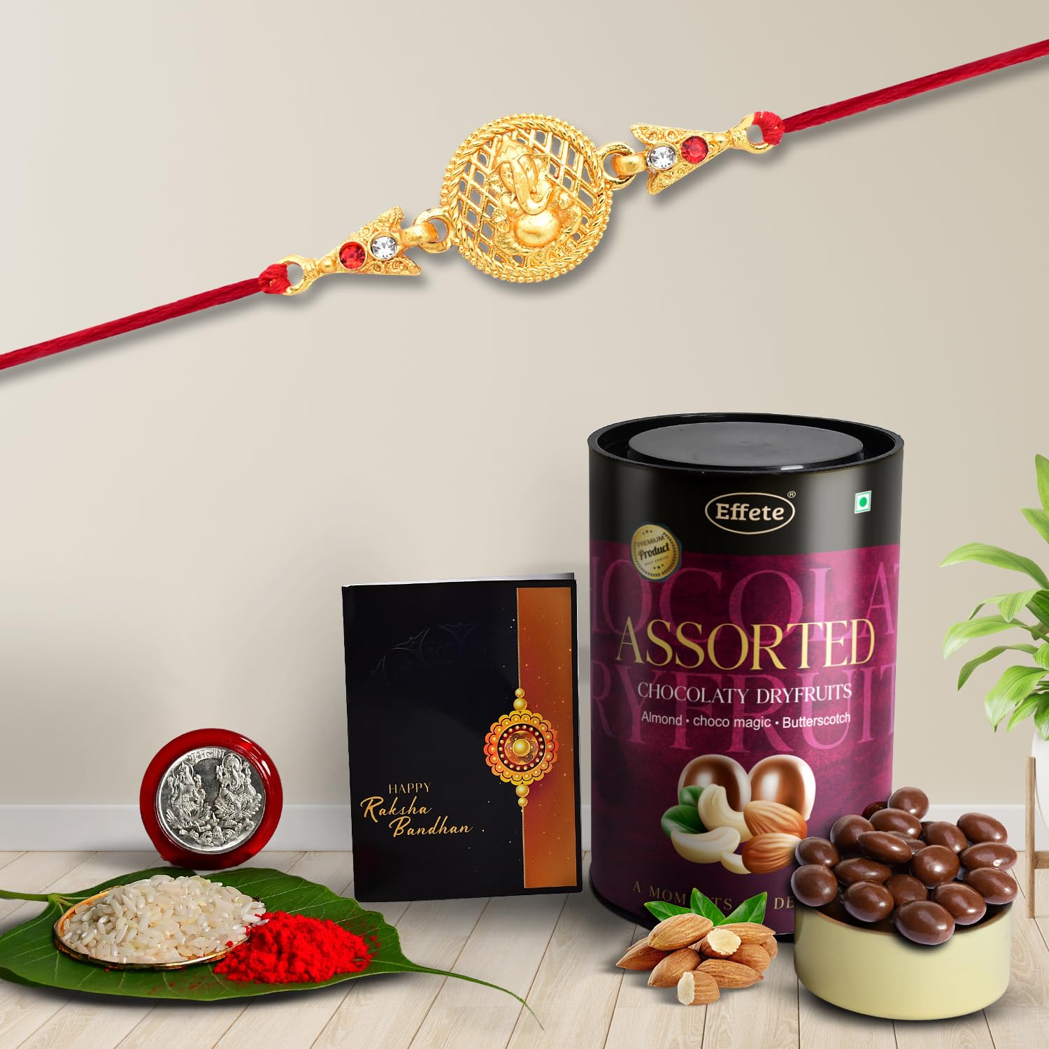 Each element in this combo is carefully chosen to make your festival meaningful. The Rakhi is designed with love and elegance, perfect for expressing your feelings to your brother. The roli-chawal pack comes in a neat container for hassle-free rituals, while the coin adds a touch of tradition. The greeting card lets you share a heartfelt message, and the chocolate adds a sweet moment to the day.