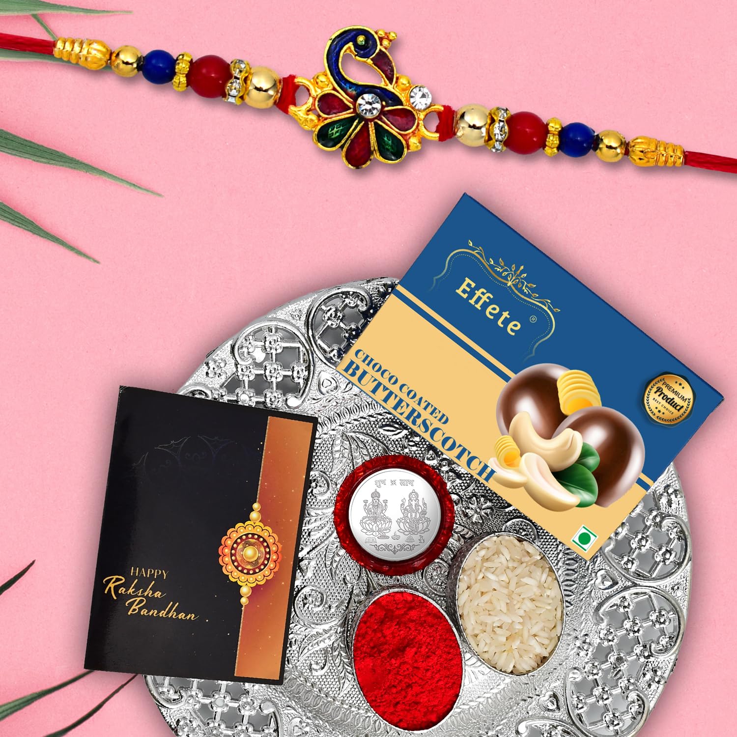(K2_410+411_DS+BS32) Rakhi Combo Chocolate Butter Scotch 32gm & Silver Pooja Thali with Pooja Coin & Greeting Card, | Rakhi gift set | Rakhi thali | rakhi gifts | Kids car rakhi | Rakhi with plate | rakhi thali set | rakhi with gift | rakhi